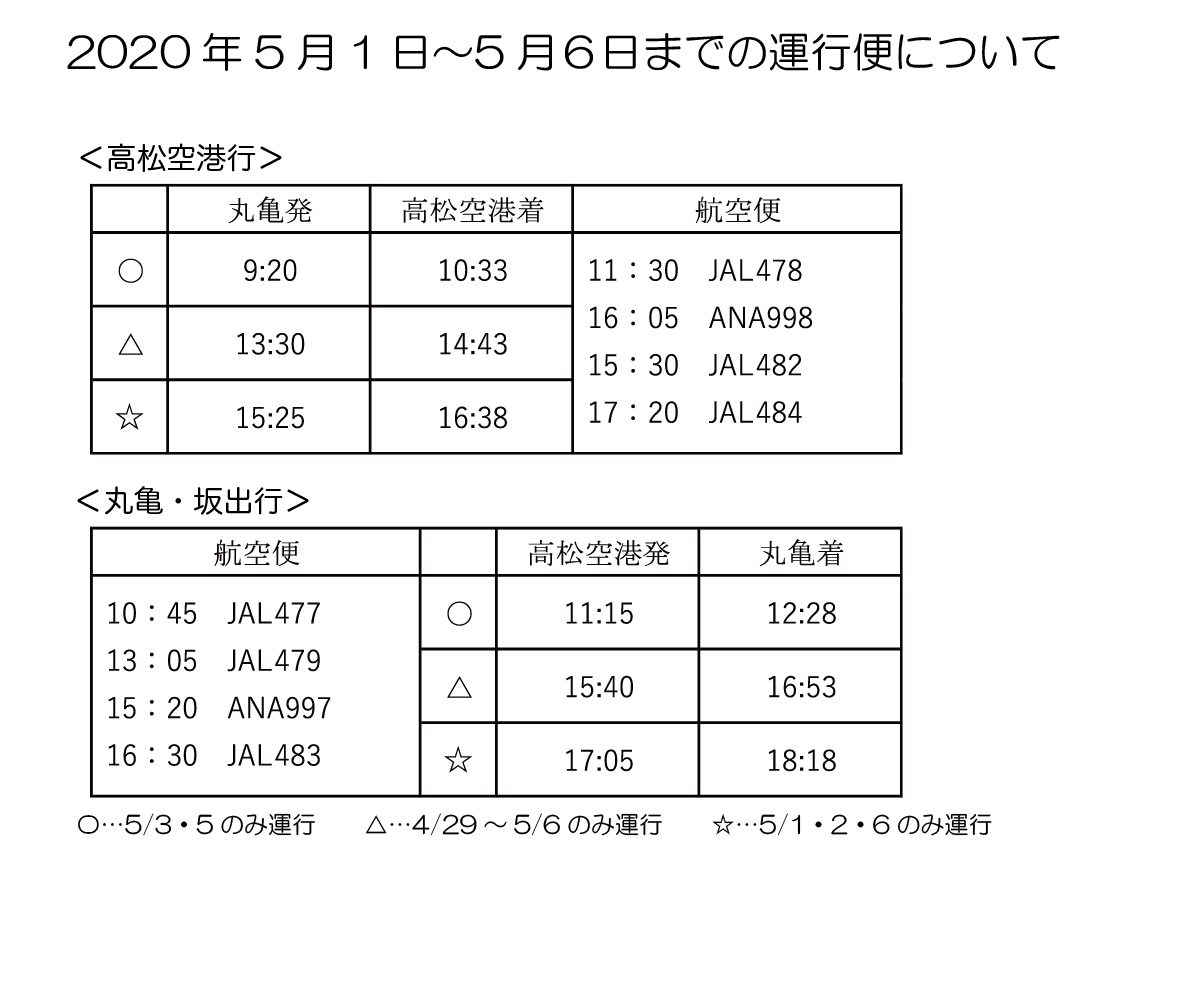 (一部変更)5/1〜5/6空港リムジンバス(丸亀坂出線)運行体制のお知らせ 2020/04/30 5/1〜5/6、航空便の運行状況の変更に伴い、当空港リムジンバス(丸亀坂出線)において下記の通り運行を行います。 なお、丸亀善通寺線につきましてはこの間、全て運休となります。