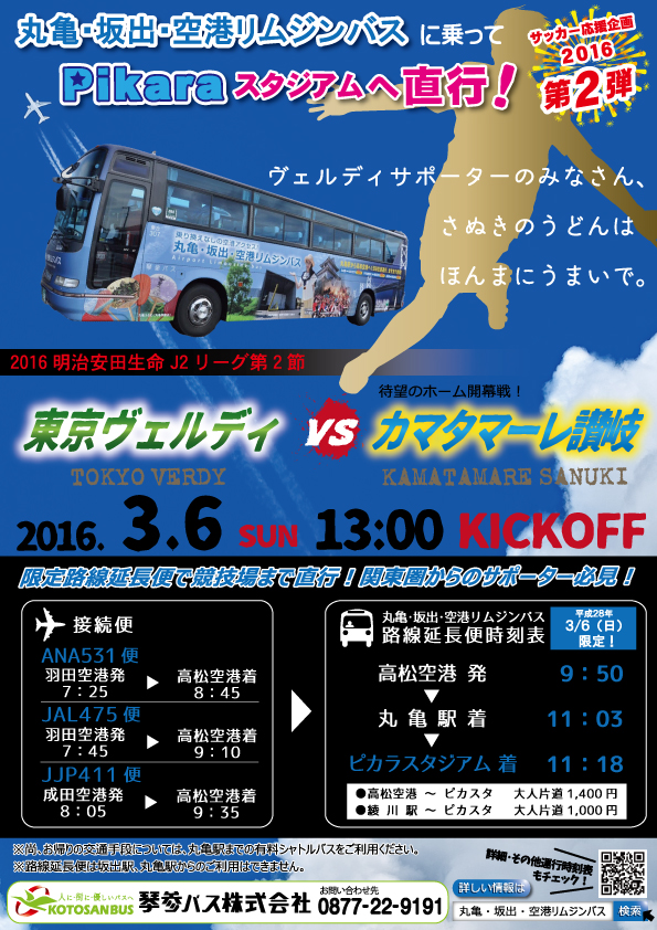 平成28年3月6日に開催される、開催されるJ2リーグの試合(カマタマーレ讃岐vs東京ヴェルディ)限定で、空港リムジンバス一部運行便をPikaraスタジアムまで延長します。