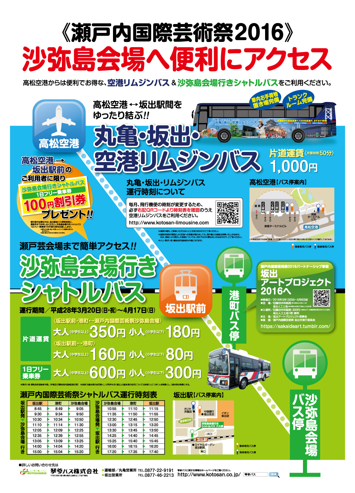 高松空港より瀬戸内国際芸術祭2016沙弥島会場(香川県坂出市)へお越しの皆様、ゆったり便利な「丸亀・坂出・空港リムジンバス」と「沙弥島会場行きシャトルバス」をぜひご利用ください。