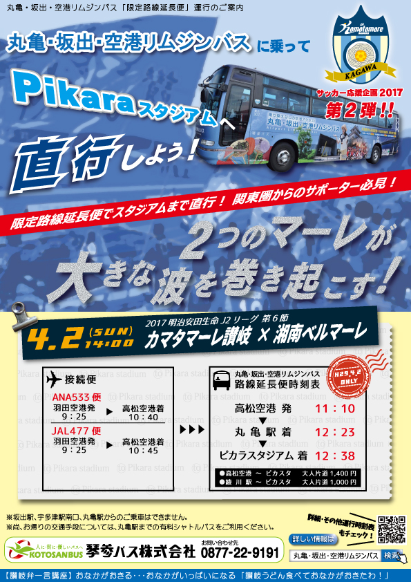 平成29年4月2日に開催されるJ2リーグ第6節において、空港リムジンバス一部運行便をPikaraスタジアムまで延長します。羽田・成田〜高松航空便ご利用のサポーターの皆様、是非ご利用ください。